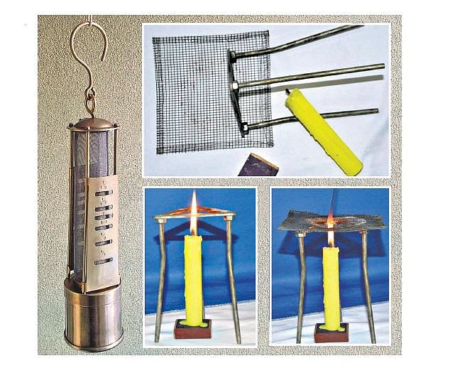 மெழுகுவர்த்தி திரியைக் காப்பு விளக்கின் திரியாகவும், எரியும் மெழுகுவர்த்தி சுடரைக் காப்பு விளக்குச் சுடராகவும், கம்பி வலையை உருளை வடிவ உலோகக் கம்பி வலையாகவும் கற்பனை செய்துகொள்ளுங்கள்.