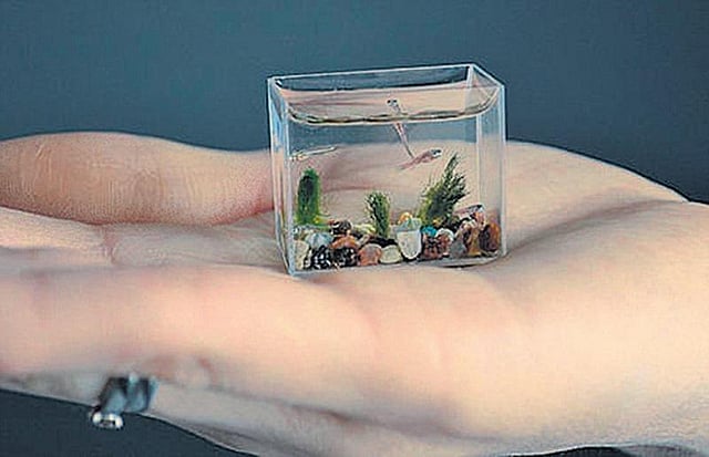 அந்த மீன் தொட்டியோடு நீளம் எவ்வளவு தெரியுமா? வெறும் 30 மில்லி மீட்டர்தான். அதாவது நம் கையில் துளி என்பதற்குக் கை நுனியைக் காட்டுவோம் இல்லையா அந்த அளவுக்குத்தான் தொட்டியின் நீளம். 24 மில்லி மீட்டர் அகலமும், 14 மில்லி மீட்டர் உயரமும்தான் இருக்கிறது இந்த மீன் தொட்டி. மீன் தொட்டியை எடுத்து உங்களுடைய உள்ளங்கையில் வைத்தால் ஒரு குட்டி கல் இருப்பது போலத்தான் தெரியும். அந்தளவுக்கு இந்த மீன் தொட்டியை அனாட்டோலி ரொம்ப குட்டியாகச் செய்திருக்கிறார்.