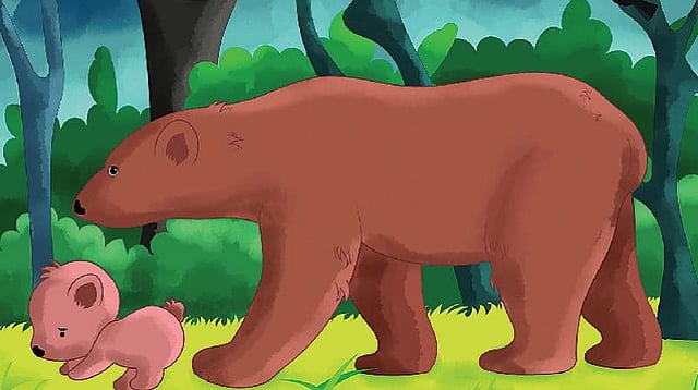 தாய்க் கரடியும் குட்டிக் கரடியும் மீன் பிடிப்பதற்காக ஆற்றை நோக்கி நடக்க ஆரம்பித்தன.