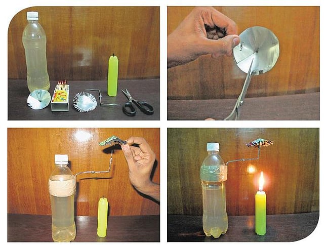 5. பாட்டிலில் செங்குத்தாகப் பொருத்தப்பட்ட காம்பஸின் மேல் முனையில் கூம்புக் காற்றாடியைச் சுழலுமாறு வையுங்கள்.