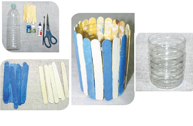 பிளாஸ்டிக் பாட்டில், பெயிண்ட் பிரஷ், உங்களுக்குப் பிடித்த இரண்டு சாயங்கள், கத்தரிக்கோல், பசை, ஐஸ் குச்சிகள்.