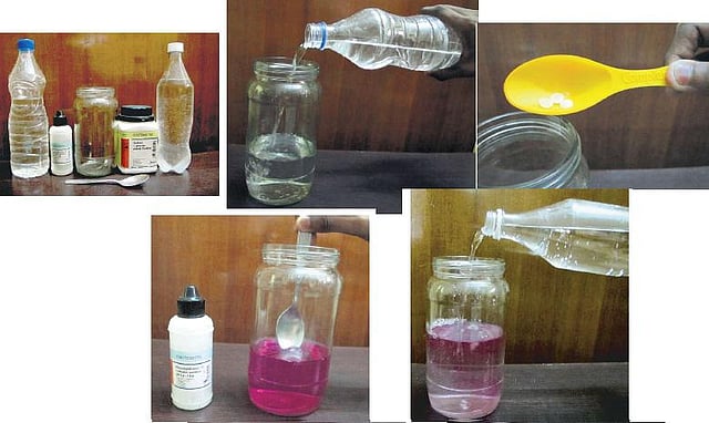(2) அதில் இரண்டு அல்லது மூன்று சோடியம் ஹைடிராக்ஸைடு மாத்திரைகளைப் போட்டு நன்றாகக் கலக்கி விடுங்கள். இப்போது பாட்டிலில் சோடியம் ஹைடிராக்ஸைடு கரைசல் தயார்.
