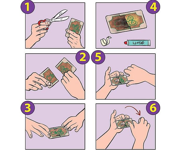3. இப்போது, வலது கையின் ஆள்காட்டி விரலை அட்டையினுள் நுழைக்கும்போது, யாருக்கும் தெரியாமல் தந்திரமாக உங்கள் இடது கையின் மோதிர விரலின் நுனியை அட்டையினுள் நுழைத்துக்கொள்ளுங்கள்.