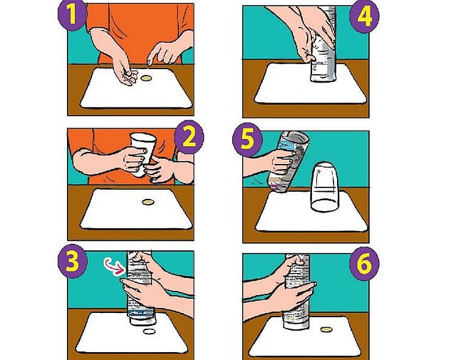 கண்ணாடி டம்ளரின் அடிப்பக்கத்தில் முன்னதாக வெள்ளைத் தாள் ஒன்றை டம்ளர் அளவுக்கு வட்டமாக வெட்டி ஒட்டிவிட வேண்டும். அந்த தாளும், மேஜை மீது வைக்கப்பட்டுள்ள தாளும் ஒரே நிறத்தில் இருக்குமாறு பார்த்துக் கொள்ள வேண்டும். தாள் ஒட்டப்பட்ட டம்ளரின் பகுதியை பேப்பர் மீது நீங்கள் கவிழ்த்து வைப்பதால், அதில் தாள் ஒட்டப்பட்டு இருப்பது யாருக்கும் தெரியாது.