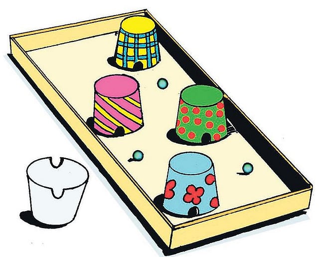 4 இப்போது கோலிக்குண்டுகளை மூடியின் மீது போட்டு அவை கப்புகளில் உள்ளே புகுந்து வெளியே வருமாறு செய்து விளையாடுங்கள். நேரம் போவதே தெரியாமல் விளையாடலாம்.