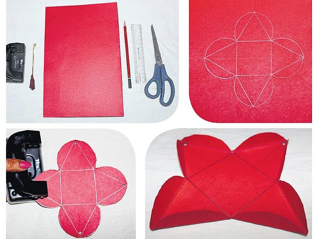 # படத்தில் காட்டியபடி வண்ண காகிதத்தில் வரைந்துகொள்ளுங்கள். (நடுவில் சதுரத்தை வரையுங்கள். சதுரத்தின் நான்கு மூலைகளிலும் முக்கோணம் வரையுங்கள். பின்னர் முக்கோணத்தைச் சுற்றி அரை வட்டம் வரையுங்கள்)