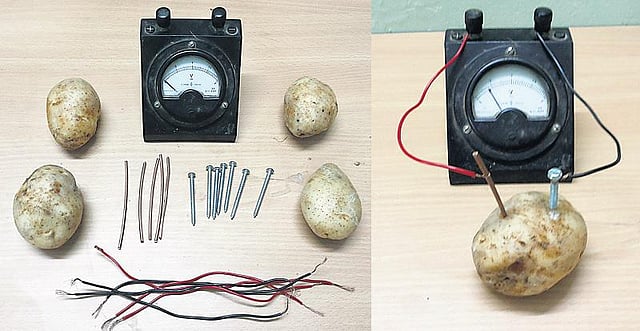 ஓர் உருளைக் கிழங்கு எப்படி மின்சாரத்தை உருவாக்குகிறது? உருளைக்கிழங்குகளின் எண்ணிக்கை அதிகமாகும்போது வோல்ட் மீட்டர் காட்டும் அளவும் அதிகமாகிறது. இதற்கான காரணம் என்ன?