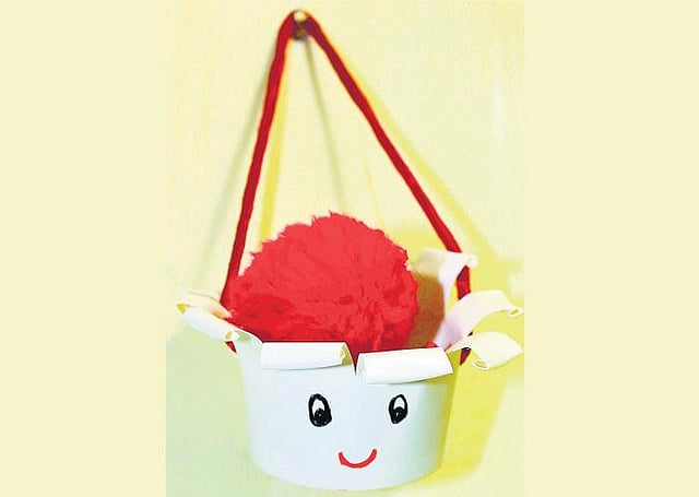 5. கூடையை அழகுப்படுத்த, படத்தில் காட்டியதுபோல பொம்மை உருவத்தை வரைந்துகொள்ளுங்கள். கூடைக்குள் சிறு பொம்மை, காகிதப் பூக்களை வைத்தால் அலங்காரப் பொருள் தயார். அதை சுவரில் மாட்டி வைத்தால் பார்ப்பதற்கு அழகாக இருக்கும்.
