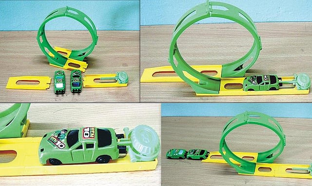 1.செங்குத்து வட்டப்பாதையில் செல்வதற்கான பிளாஸ்டிக் பட்டையையும் பொம்மைகார்களையும் கடைகளில் வாங்கிக்கொள்ள வேண்டும்.
