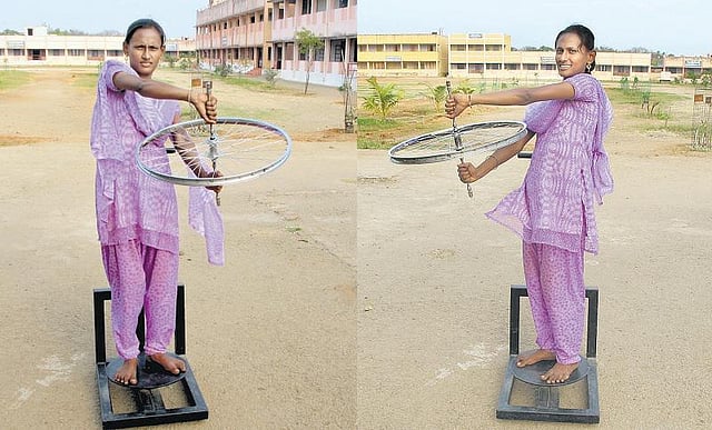 2. சைக்கிள் சக்கரத்தில் இருபுறமும் அரை அடி நீளத்துக்குக் கம்பிகளை இணைத்துக்கொள்ளுங்கள்.