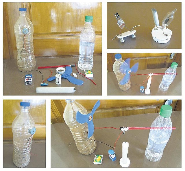 9 வோல்ட் பேட்டரி, சிறிய மோட்டார், பிளாஸ்டிக் காற்றாடி, குழல் விளக்கில் உள்ள ஸ்டார்டர், மெழுகுவர்த்தி, தீப்பெட்டி.