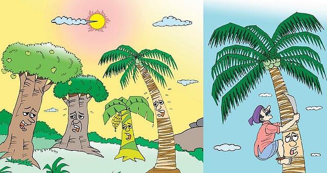 “இங்க மட்டும் என்னவாம், ரொம்ப உயரமா இருக்கறதால சூரிய ஒளி மண்டையைப் பிளக்குது. வேப்பமரத்தை மாதிரி மத்தவங்களுக்கு என்னால நிழல் கொடுக்க முடியலையே” எனத் தன்னிடம் உள்ள குறையைக் கூறியது தென்னை மரம்.