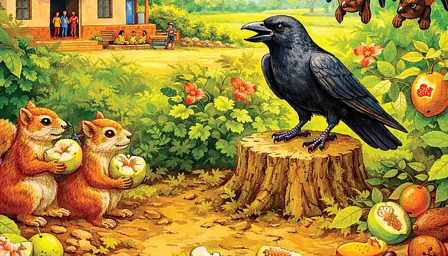 “இனி பழங்களை முழுமையாகச் சாப்பிட்டு விடுகிறோம்” என்றது அணில். கிளிகளும் வெளவால்களும் அணில் சொல்வதை ஆமோதித்தன. காகம் மகிழ்ச்சியாக அங்கிருந்து பறந்து சென்றது.