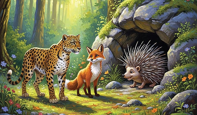மகிழ்ச்சியாக நரியுடன் புறப்பட்டது சிறுத்தை. இரண்டும் முள்ளம்பன்றி வசிக்கும் புதரின் அருகில் வந்தன. “நண்பனே, கொஞ்சம் வெளியே வா. ஒரு உதவி கேட்டு வந்திருக்கிறோம்” என்று முள்ளம்பன்றியை நரி அழைத்தது. முள்ளம்பன்றி புதருக்கு உள்ளிருந்து எட்டிப் பார்த்தது.