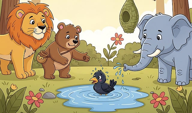 “சிங்கராஜா, ஆற்றங்கரையில் பறவைக் குஞ்சு ஒன்று வழிதவறி வந்து அழுது கொண்டிருக்கிறது” என்று கரடி சொன்னதும், ஆற்றங்கரைக்குப் புறப்பட்டது சிங்கராஜா. அங்கே குஞ்சு ஒன்று அழுது கொண்டிருக்க, அதனைச் சுற்றி மற்ற விலங்குகள் ஆறுதல் சொல்லிக் கொண்டிருந்தன.