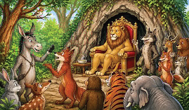 “நரியைக் கண்காணித்துக் கொண்டே இரு. ஏதாவது தவறாக இருந்தால் என்னிடம் சொல்” என்றது கழுதை. பனங்காட்டு நரியும் குள்ளநரியும் பக்கத்துக் காட்டு சிங்கராஜாவைச் சந்தித்தன. “எங்க ராஜா உடல்நலம் இன்றி இருக்கிறார். திறம்பட இந்தக் காட்டை ஆளும் நீங்களே எங்கள் காட்டையும் ஆள வேண்டும் என்று அனைவரும் ஆசைப்படுகிறோம்” என்றது பனங்காட்டு நரி.