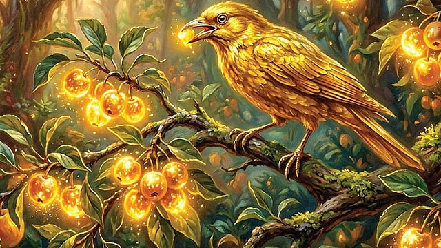 தேவதை வைத்த முட்டையிலிருந்து வெளிவந்த குஞ்சு வேகமாகப் பறக்கத் தொடங்கியது. மரத்தின் உயரே சென்று பழுக்காமல் இருந்த இரண்டு காய்களையும் கொத்தியது. உடனே அந்தக் காய்கள் பொன் நிறத்தில் மாறின. இந்தக் குஞ்சின் இறக்கைகளும் தங்கநிறத்தில் மாறிவிட்டன.