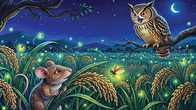 கென் பயத்தை மறந்து சிரித்தது. அதுவரை இருட்டாகத் தெரிந்த அந்த வயல்வெளி, மின்மினிகளின் ஒளியால் ஒரு மாய உலகம் போல அழகாகத் தெரிந்தது!