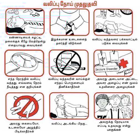 # அடிபட்டிருந்தாலோ, ஐந்து நிமிடங்களுக்கு மேல் வலிப்பு நீடித்தாலோ அல்லது நிற்காமல் திரும்பத் திரும்ப வலிப்பு வந்து கொண்டிருந்தாலோ, வலிப்பு நின்ற பிறகும் சுவாசிப்பதற்குச் சிரமப்பட் டாலோ - மருத்துவரையோ அல்லது ஆம்புலன்ஸையோ உதவிக்கு அழைக்கவும்.