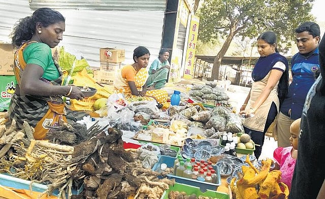 ‘அந்தக் காலத்துல எங்க பாட்டன், பூட்டன் எல்லாம் இதே வெள்ளியங்கிரி மலையைச் சுத்தி சுத்தி காட்டுப்பொருட்களை சேகரிச்சு கீழ் நாட்டு சனங்களுக்கு கொடுப்பாங்க. அதை வச்சு நாட்டு வைத்தியம் செய்து சனங்களுக்கு கொடுப்பாங்க. அதையேதான் இப்ப நாங்க செய்யறோம். எங்க வீட்டு ஆம்பிளைகள் காட்டுக்குள்ளே போய் மூலிகைகளைக்கொண்டு வந்து கொடுப்பாங்க. அதை நாங்க பக்குவப்படுத்தி இப்படி விற்பனைக்குக் கொண்டு வருகிறோம்!’ என்கிறார்கள் பழங்குடிப் பெண்கள்.