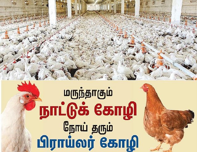 கிராமத்து வீடுகளிலும் வயல்வெளிகளிலும் ஆங்காங்கே சிதறிக் கிடக்கும் சிறுதானியங்களைக் கொறித்துத் தின்றுவிட்டு, உற்சாகமாக அங்குமிங்கும் திரிந்துகொண்டிருந்தன நாட்டுக் கோழிகள். ஆனால், பிறந்து சில நாட்களிலேயே பல்வேறு செயற்கை மருந்துகளால் செறிவூட்டப்பட்டு, அளவுக்கு அதிகமாகத் தீவனத்தைச் சாப்பிட்டுவிட்டு, எங்கும் நகர வழியின்றி, பல்வேறு நோய்களைத் தனக்குள் வைத்துக்கொண்டு வாழ்கிறது பிராய்லர் கோழி.
