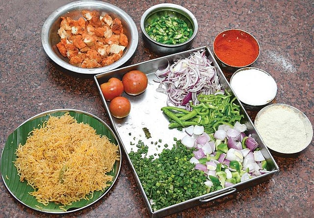 வெங்காயம், தக்காளி அரிந்துகொள்ள வேண்டும்; மசாலா வகைகளை இடித்துக் கொள்ள வேண்டும்; சீரகம் மிளகைத் தனியாக வைத்துக்கொள்ள வேண்டும்; இஞ்சி பூண்டை விழுதாக அரைக்க வேண்டும்; தழைகளைப் பொடியாக அரிந்துகொள்ள வேண்டும்.