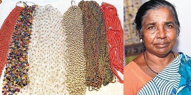 பாசி மணி, முத்து மாலை, கல் மணி, ஐயப்பன் மாலை, ஸ்படிக மணி மாலை, வண்ணக் கொலுசு, மோதிரம், வண்ணக் கல் டாலர், காப்பு போன்ற ஏராளமான கைவினைப் பொருட்களை மிகவும் நேர்த்தியாகவும் வேகமாகவும் செய்யும் வசந்தாவைப் பார்ப்பதற்கு ஆச்சரியமாக இருக்கிறது.