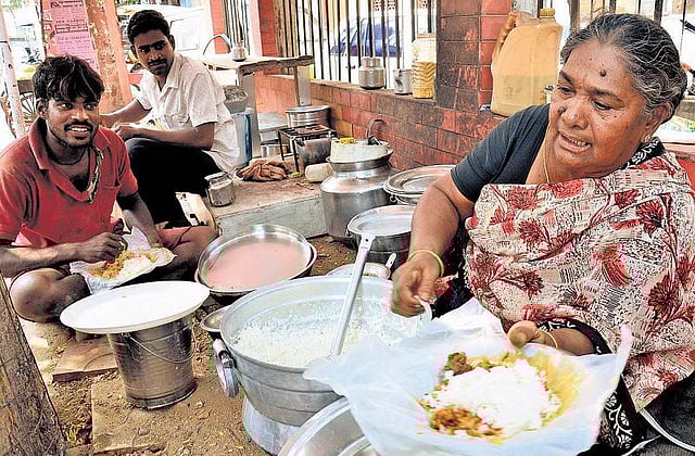 கிள்ளி வைக்கிற இடத்தில் அள்ளிக் கொடுக்கிற கைகளுக்குச் சொந்தக்காரர்கள் தங்கமும் லட்சுமியும். உணவகங்களில் அளவு சாப்பாடு சாப்பிட்டுப் பழகியவர்களுக்கு, தட்டு நிறைய சோறு அள்ளி வைக்கும் இந்தப் பெண்களின் செயல் ஆச்சரியம் தரலாம். சென்னை எழும்பூரில் ஆல்பர்ட் தியேட்டர் அருகே சாலையோரக் கடை நடத்துகிற தங்கம், வெட்டு ஒண்ணு துண்டு ரெண்டாகப் பேசுகிறார். சிறு ஓலைக் கொட்டகைதான் கடை. அதனுள்ளே இருவர் மட்டுமே உட்கார முடியும். அதையொட்டிப் போடப்பட்டிருக்கிற இரண்டு மர பெஞ்சுகளின் மீது ஆட்டோக்காரர்கள் முதல் கல்லூரி மாணவர்கள்வரை பல தரப்பினரும் கையில் தட்டைப் பிடித்தபடி சாப்பிடுகிறார்கள்.