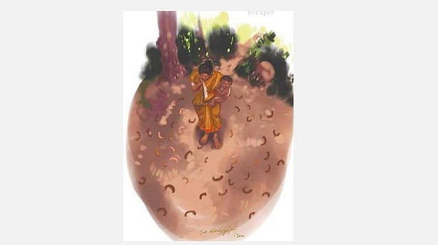 மந்தையில் கூடிக் கிடக்கும் தன் ஊர்க்காரர்களைப் பற்றியெல்லாம் கவலைப்படாத அருவக்கொடி, காரியமே கண்ணாக வனத்துக்குப் புறப்பட்டாள். அவள் தோளில் ஒரு சாக்குப்பையில் தொட்டி வேட்டியும் அதைக் கட்ட வேண்டிய கயிறுமிருக்க இடுப்பில் அவளின் குலசாமியின் பெயரை ஆசையாய் வைத்த அய்யனார் ஒரு வயதுக் குழந்தையாக இருந்தான். நேற்று பெய்த மழையில் இன்று நிலமெல்லாம் புளியம்பழம் உதிர்ந்துகிடக்கும் வனத்துக்குள் நுழைந்த உடனே அவள் நெஞ்சத்தில் மகிழ்ச்சி கரைபுரண்டது. அவள் நினைத்தது போலவே நேற்று மழைக்காக வீசிய காற்றில் புளியம்பழங்களும் நெல்லிக்காய்களும் நிலம் தூந்துக்கிடந்தன. வனத்தின் எதிரில் பெறக்கினால் யாராவது பார்த்துவிடுவார்கள். பிறகு தனக்குப் போட்டியாகப் பெறக்க வந்துவிடுவார்கள். அதுமட்டுமில்லாமல், மழை பெய்திருப்பதால் ‘ரேஞ்சர் வாச்சர்’ வரக்கூடுமென்றும் எண்ணிய அருவக்கொடி வனத்துக்குள்ளே சற்று தூரம் போனாள். அவள் காலில் புளியம்பழங்களும் நெல்லிக்காய்களும் மிதிபட்டன. தோளில் கிடந்த பிள்ளையைத் தூக்கிப் பால்கொடுத்தாள். பால் சிந்திய வாயோடு குழந்தை அவள் முகம் பார்த்துச் சிரித்தது. பிள்ளையின் முகம் பார்த்த அவளுக்கு அதனோடு கொஞ்சிக் குலவ வேண்டுமென்று இருந்தது. ஆனால், இப்போது கொஞ்ச முடியாது என்று நினைத்தவள் கப்பும் கிளையுமாயிருந்த இலுப்பை மரத்தில் கயிற்றை வீசித் தொட்டிலைக் கட்டினாள்.
