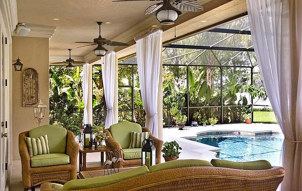 வெளிப்புற அறைகளை வடிவமைக்கும்போது விளக்குகள், கலைப்பொருட்கள் எனக் கூடுதலான அம்சங்களைக் கணக்கில் எடுத்துக்கொள்ள வேண்டும். இந்தத் திரைச்சீலைகளை ஒரே வண்ணத்தில் தேர்ந்தெடுக்காமல் இரண்டு முரண்பட்ட வண்ணங்களிலும் தேர்ந்தெடுக்கலாம்.