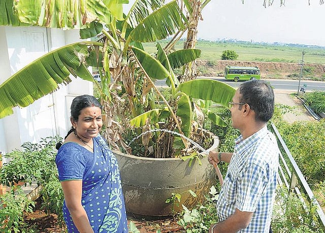 மரம் வளர்க்க விரும்பும் சிலர் தங்கள் வீட்டு மாடியிலேயே தண்ணீர் நிரப்பிவைக்கும் டிரம்மில் மண் நிரப்பி அதில் மரங்கள் வளர்க்கின்றனர். மாடிக்கும் மரங்களுக்குமிடையே ஒரு பெரிய இடைவெளி இருக்கும். ஆனால், இவர் மாடியில் தோட்டம் அமைத்து அதில் வாழை, தென்னை மரங்கள் வைத்து மாடியையே விவசாய நிலமாகப் பராமரித்து வருகின்றார்.