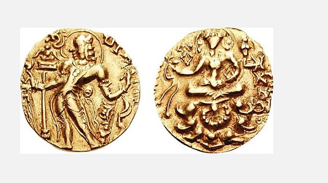 கவிதைப்பிரியரான சமுத்திர குப்தர் வெளியிட்ட தங்க நாணயங்களில் அவர் வீணை வாசிப்பது போலிருக்கும். கவிராஜா என அழைக்கப்பட்டவர்.