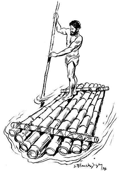 பொருட்களைச் சுமந்து செல்ல விலங்குகளைப் பயன்படுத்திய மனித இனம் நீர்ப்பரப்புகளைக் கடந்து செல்ல மரக்கட்டைகளைப் பயன்படுத்தியது. மிதக்கும் தட்டையான தளம். மனிதர்களது கட்டுப்பாட்டை மீறி ஆற்றின் வேகமும் ஓதங்களின் இழுவிசையிலும் சிக்குண்டு கழிமுகத்துவாரம் வழியாக மனிதர்கள் கடலை அடைந்திருக்க வேண்டும். திகிலூட்டும் முதல் கடலனுபவம் அது.