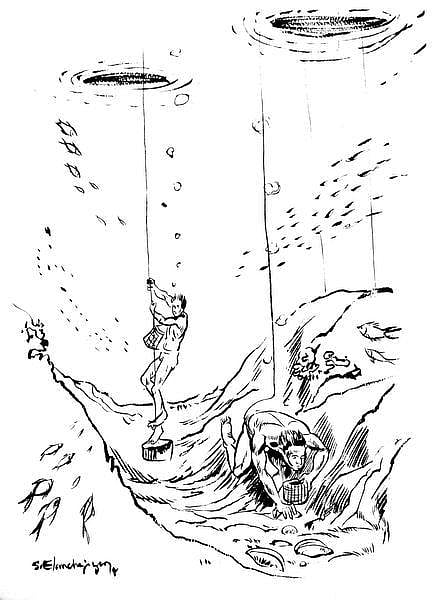 குளியாளி கீழே இறங்கித் தரை தொட்ட பிறகு கல் உருளையைத் துணையாள் மேலே தூக்கிவிடுவார். குளியாளி கயிற்றால் படகோடு பிணைக்கப்பட்டிருப்பார். குளியாளி தன் தேவையைச் சொல்லும் தகவல் பாதை இந்தக் கயிறு. பொதுவாக அக்காள் கணவர் குளியாளி என்றால், மைத்துனர்தான் துணையாள்.. துணையாள் பிடித்திருப்பது வெறும் கயிறு அல்ல, அக்காவின் தாலிக்கயிறு!