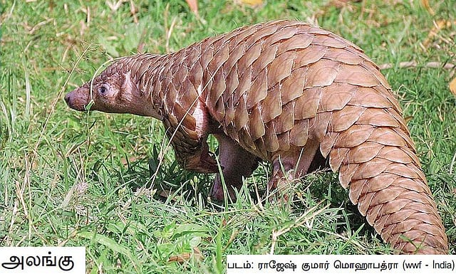 வறண்ட புதர்க்காடுகளில் வாழும், பூனை அளவு உள்ள, ஆனால் சற்றே நீளமான இதை ஆங்கிலத்தில் ‘பங்கோலின்’ (தமிழில்: எறும்புத்தின்னி) என்பர். இதை ‘அலுங்கு’ என்றும் சிலர் குறிப்பிடுவர். நீண்ட வாலுடன், கூர்மையான முகம் கொண்ட இதன் உடல், உறுதியான செதில்களால் மூடப்பட்டிருக்கும். பாலூட்டிகளில் இத்தகைய செதில்கள் கொண்ட ஒரே உயிரினம் அலங்குதான். எட்டு வகையான அலங்கு இனங்கள் ஆசியாவிலும் ஆப்பிரிக்காவிலும் பரவியிருக்கின்றன. இந்தியாவில் மட்டும் இரண்டு இனம் உண்டு.