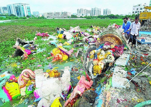 ஆனால், நீர்நிலைகளே அருகிவிட்ட இந்தக் காலத்தில் செயற்கைப் பொருட்களால் தயாரிக்கப்பட்ட சிலைகள் பெருகி விட்டன. அவற்றை அருகில் உள்ள நீர்த்தேக்கங்களிலும், கடற்கரையோர மக்கள் கடலிலும் கரைக்கிறார்கள்.