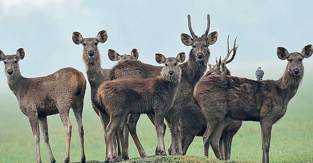 இப்படி ஒரு ‘ஃபேமிலி குரூப் போட்டோ’ கிடைப்பது அரிதிலும் அரிது. அப்போது எடுத்த படம்தான் இது. சில நொடிகள்தான், பிறகு அவை கலைந்து சென்றுவிட்டன. ஆங்கிலத்தில் ‘சாம்பர்’ என்றும் தமிழில் ‘கடமான்’ என்றும் அழைக்கப்படும் இந்த மான், தெற்காசியா, தென் கிழக்கு ஆசியா, தென் சீனா போன்ற பகுதிகளில் அதிக அளவில் காணப்படுகிறது. தமிழகத்தில், முதுமலைப் பகுதியில் இதைக் காண முடியும். எனினும், உலக அளவில், இந்த மான் இனத்தின் எண்ணிக்கை குறைந்துகொண்டுதான் வருகிறது. எனவே, இது ‘ஆபத்தான நிலையில்’ உள்ள உயிரினமாகக் கருதப்படுகிறது.