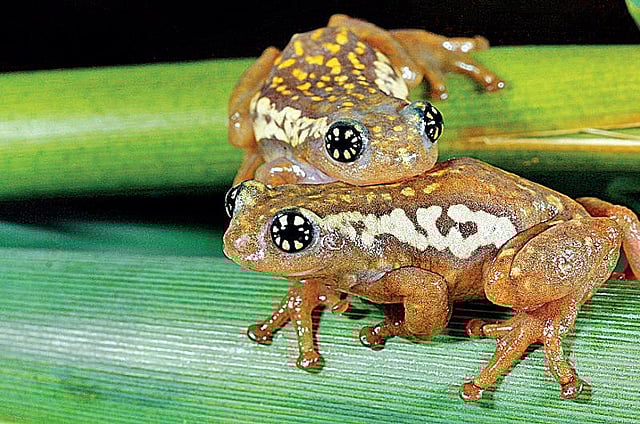 மழைக் கால மாலை வேளையில் அதிக எண்ணிக்கையில், சப்தமிடும் இந்தத் தவளைக் கூட்டங்களை காணலாம். அழகிய கண்களுடன், முக்கோண வடிவிலான தலைகளைக் கொண்டிருக்கும். தோல் பகுதி உலராமல் இருக்க, அடிக்கடி நீரைத் தேடி செல்கின்றன. ஆறுகளை ஒட்டிய காடுகளில் வளரும் ஓக்லாண்ட்ரா என்ற மூங்கிலைச் சார்ந்தே இந்த தவளைகளின் வாழ்க்கை அமைந்துள்ளது.