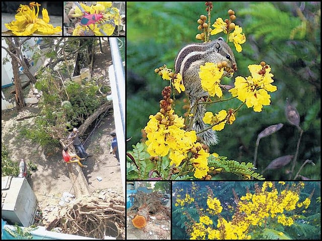 வீட்டை நெருங்கியபோதுதான் சட்டென்று ஒரு விஷயம் உறைத்தது, அந்த இடமே வெறிச்சோடிக் கிடந்தது. கடந்த சில ஆண்டுகளாக எங்களுக்கு நிழல் தந்து வந்த மஞ்சள் வாகை (ஆங்கிலப் பெயர் Copper pod, அறிவியல் பெயர்: Peltophorum ferrugineum) மரம் அடியோடு பெயர்ந்து மரித்துக் கிடந்தது. அந்த மரத்துக்குக் குறைந்தபட்சம் 30-40 ஆண்டுகள் வயதிருக்கும்.