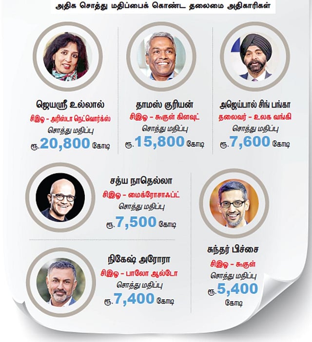 ஹூருன் நிறுவனம் சமீபத்தில் இந்திய கோடீஸ்வரர்களின் பட்டியலை வெளியிட்டது. அந்தப் பட்டியலில் முகேஷ் அம்பானி முதலிடத்திலும் கவுதம் அதானி இரண்டாம் இடத்திலும் உள்ளார். ஹூருன் நிறுவனம் கூடவே இன்னொரு பட்டியலையும் வெளியிட்டுள்ளது. உலகளாவிய பெருநிறுவனங்களில் தலைமைப் பொறுப்பில் இருக்கும் இந்தியர்களின் சொத்து விவரம் அது. அந்தப் பட்டியலில் கூகுள் நிறுவனத்தின் சிஇஓ சுந்தர் பிச்சைதான் முதல் இடத்தில் இருப்பார் என்று நீங்கள் நினைத்தால் அது தவறு. பிறகு யார்? இதோ பட்டியல்...