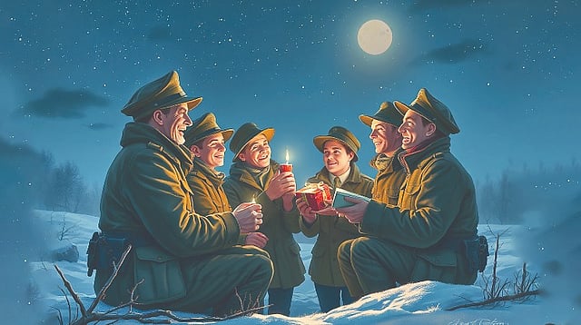 கிறிஸ்துமஸைக் கொண்டாடுவதற்காக வீரர்கள் மெழுகுவர்த்திகளை ஏற்றி, ‘அமைதி இரவு, புனித இரவு’ என்கிற பாடலைப் பாட ஆரம்பித்தனர். சிறிது நேரத்தில் ஜெர்மன் வீரர்களின் பதுங்குக் குழிகளில் இருந்தும் அதே பாடல் வெளிவந்தது. நம்பிக்கையோடு பிரிட்டன் வீரர்களும் ஜெர்மானிய வீரர்களும் மெழுகுவர்த்திகளை ஏந்திக்கொண்டு வெளியே வந்தனர். போரில் தோல்வி அடைந்து, சரணடையும்போது மட்டுமே துப்பாக்கி இன்றி கைகளை மேலே உயர்த்துவார்கள். ஆனால், அந்த இரவு ஒரு பாடல் அந்த விதியை மாற்றியது. இரண்டு நாட்டு வீரர்களும் ஒருவருக்கு மற்றொருவர் வாழ்த்துகளையும் இனிப்புகளையும் பரிமாறிக்கொண்டனர். தாங்கள் அனுபவித்த மிகச் சிறந்த கிறிஸ்துமஸ் விருந்து இதுதான் என்று பல வீரர்கள் தங்கள் குடும்பத்துக்குக் கடிதங்களை அனுப்பினர்.