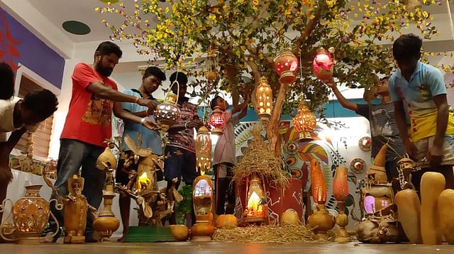 சுரைக்குடுவைக்குள் கிறிஸ்துமஸ் குடிலை உருவாக்கி புதுச்சேரி அரசுப் பள்ளி மாணவர்கள் அசத்தியுள்ளனர்.