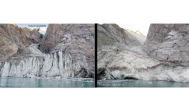 ஏன் அந்த மலைமுகட்டில் நிலச்சரிவு ஏற்பட்டது? காலநிலை மாற்றத்தின் தொடர்ச்சியாகப் புவி வெப்பம் அடைந்து கூடுதல் வேகத்தில் அந்த பகுதியில் பனி உருகுகிறது. முகட்டிலிருந்த பாறைகளுக்கு அடியிலிருந்த பனிதான் அதுவரை தாங்கி பிடித்த படி இருந்தது. மெல்ல மெல்லக் கீழே உள்ள பனி உருகி மெலிந்தது. எனவே தான் நிலச்சரிவும் அதைத் தொடர்ந்து ராட்சச சுனாமியும் ஏற்பட்டது. காலநிலை மாற்றத்தின் தொடர்ச்சியாக இதுபோன்ற நிகழ்வுகள் இனி அதிகம் நிகழக்கூடும் எனவும் எச்சரிக்கை விடுக்கப்பட்டுள்ளது.