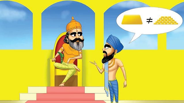 ஆம் அரசே! கோபி அளித்த பெரிய தங்கக்கட்டியிலிருந்து பெறப்பட்ட தங்கத் துண்டுகள் மொத்தம் 32 இருக்க வேண்டும். ஆனால், இந்த பொற்கொல்லர் கோபியிடம் 25 துண்டுகளை மட்டுமே கொடுத்துள்ளார் என்றார். “இதை நீங்கள் எப்படி கண்டுபிடித்தீர்கள்?” எல்லோருக்கும் புரியும்படியாக விளக்கிச் சொல்லுங்கள் என்று ஆச்சரியத்துடன் மன்னர் கேட்டார்.